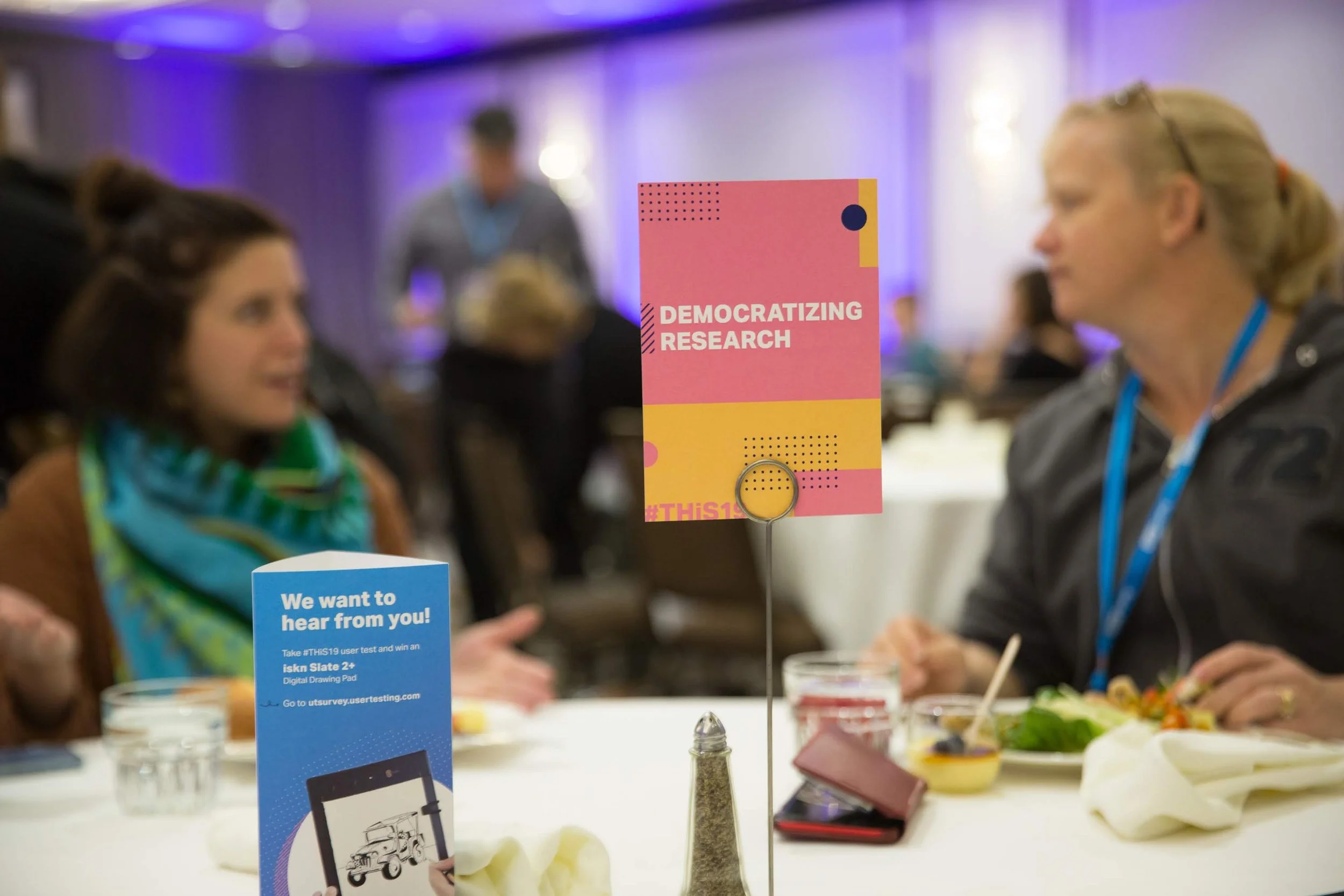 THiS 2019 handled lunch in a way that I hadn’t seen at a conference before. Each table had a topic of discussion in which participants could contribute questions or their expertise. The subjects at hand were: Democratizing Research, Mobile, Design Best Practices, Journey Mapping, Research Methodologies, B2B, International, Light Ethnography, and Tracking Insights. Attendees were also encouraged to grab buttons with the same labels to encourage mingling throughout the event.