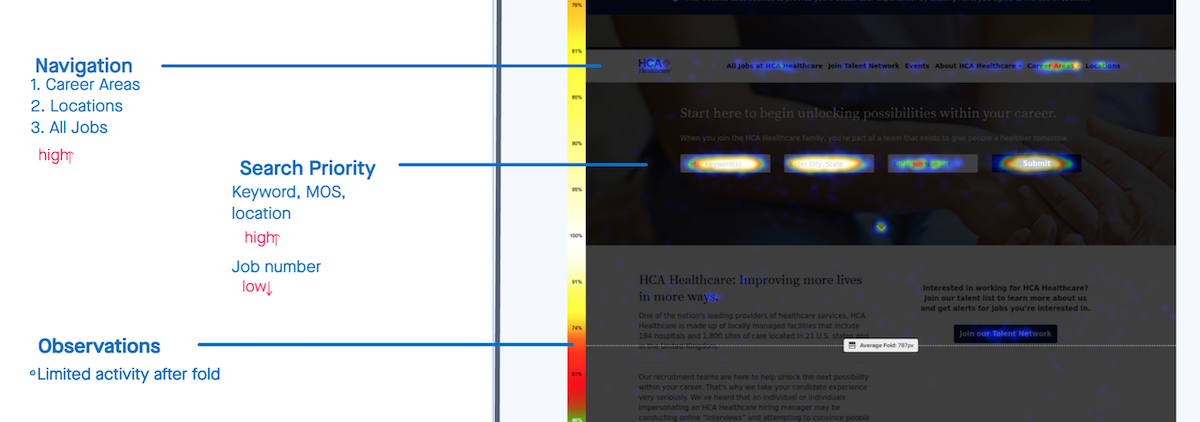 When comparing how active the main search fields and filters were to the rest of HR Recruitment’s valuable content pages, the difference was still vast. We hypothesized why these items might be missed after cross-referencing the Application and Hire Source Report from the site’s development platform Talemetry. It appeared as if recruits could be experiencing fatigue if they entered from a third-party job site. Suppose users previously encountered a streamlined, consistent, and robust search experience on LinkedIn, ZipRecruiter, and Glassdoor. In that case, according to Jakob’s law, they may be less inclined to explore our different HCA Careers site designs.