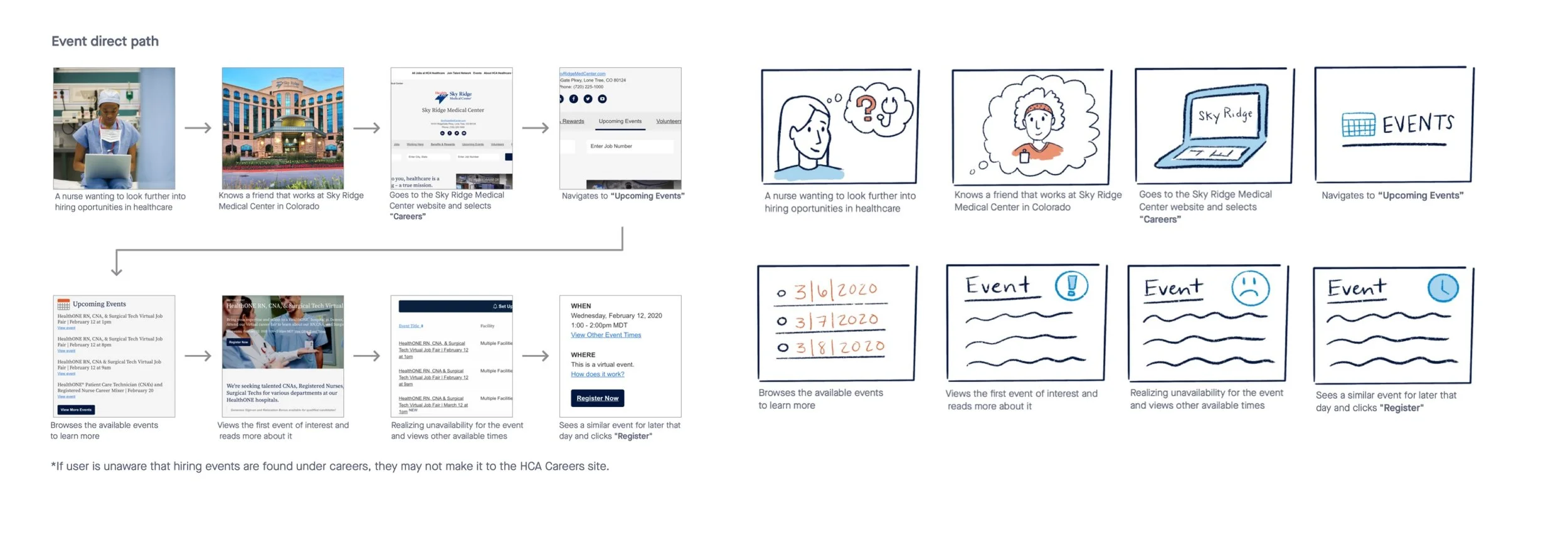 Using the hand-drawn illustrations, we constructed the ideal journeys of different tasks. To bookend discovery and fade into ideation, the Ideal State Story Boards helped support our heuristic suggestions and changes in site mapping later.